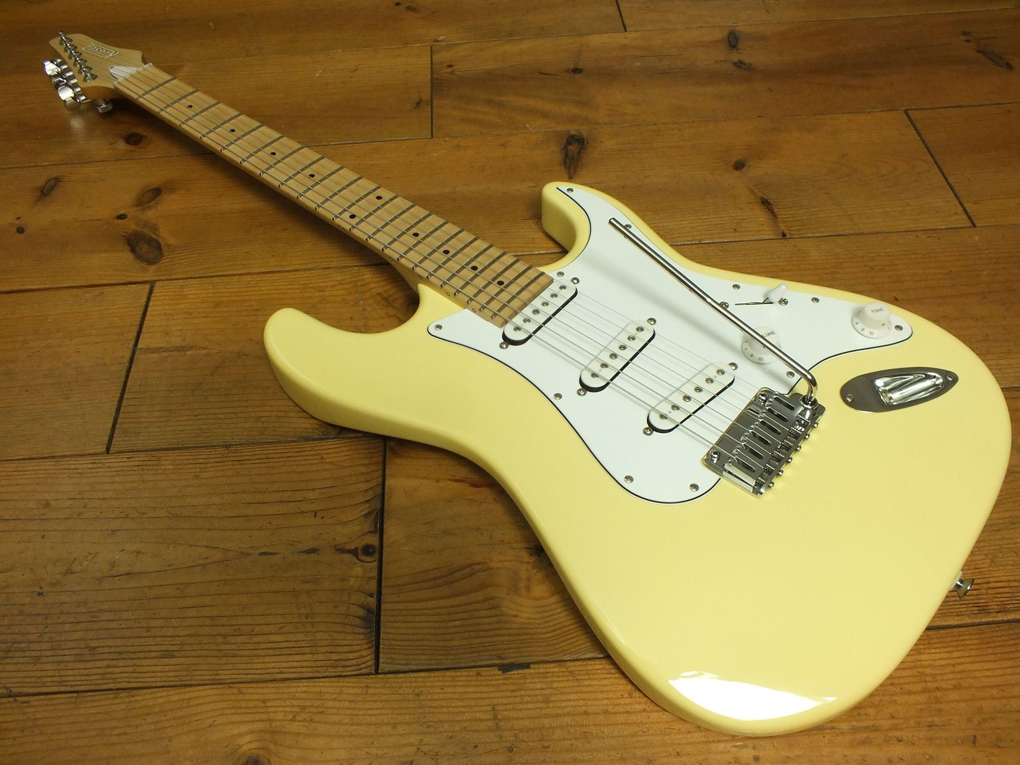 Schlanker Ahorn-Hals mit Ahorn-Griffbrett (12" Radius), 22 Jumbo Stahl-Bünden, fluoreszierenden Side Dots und Kiesel Locking Tuners, die im Zusammenspiel mit dem Gotoh Zweipunkt-Tremolo für exzellente Stimmstabilität sorgen.