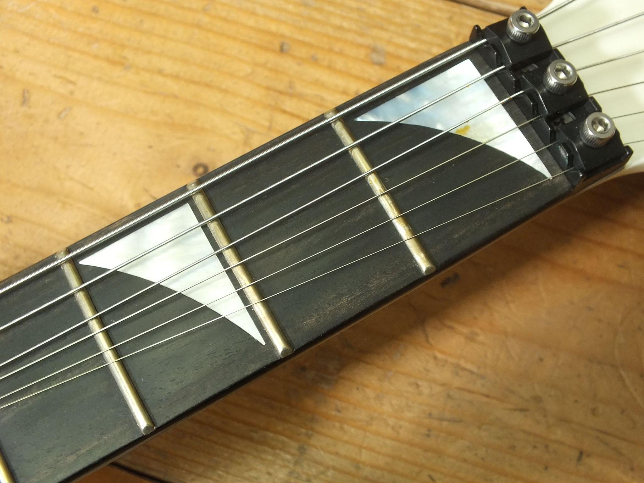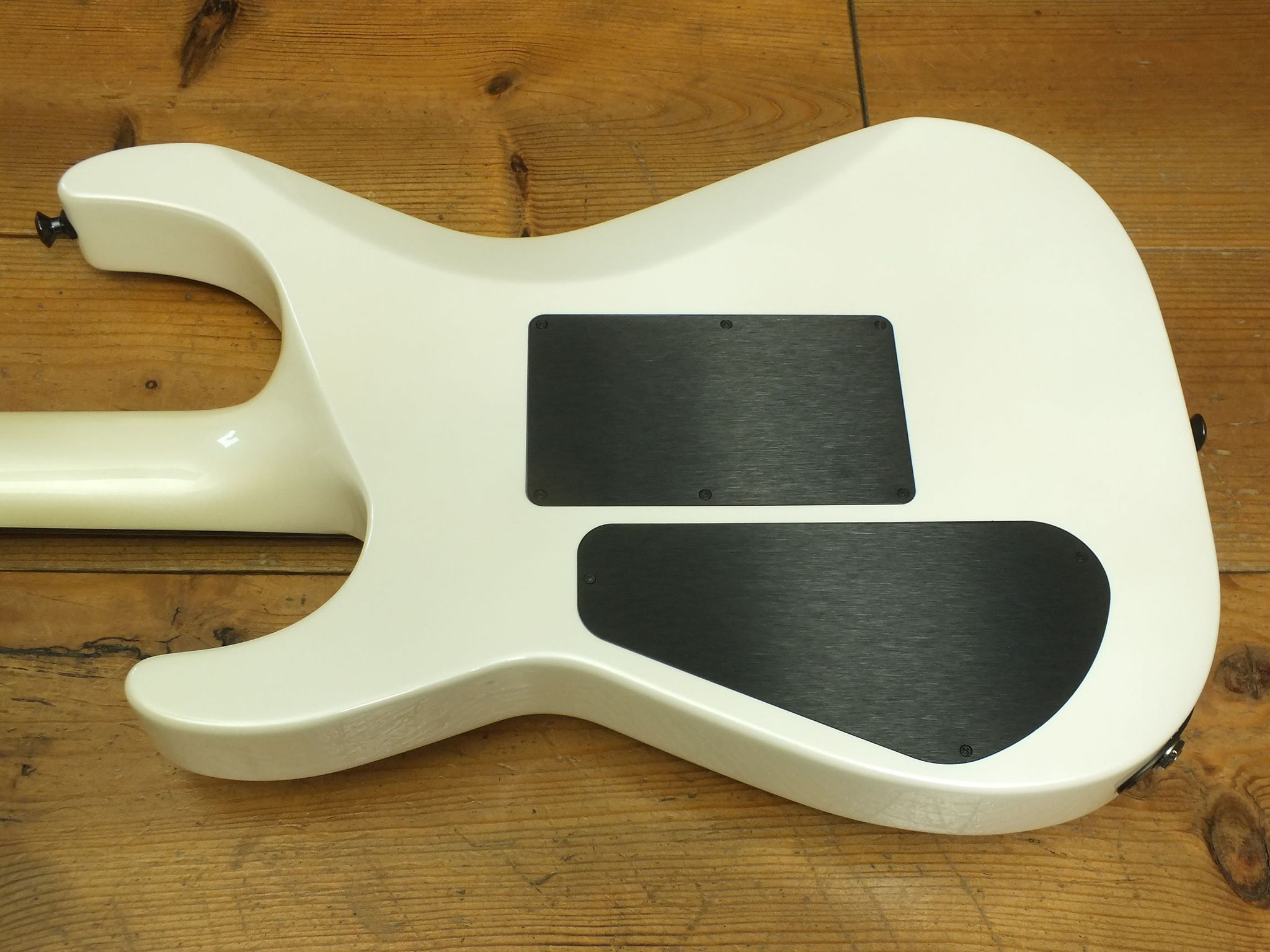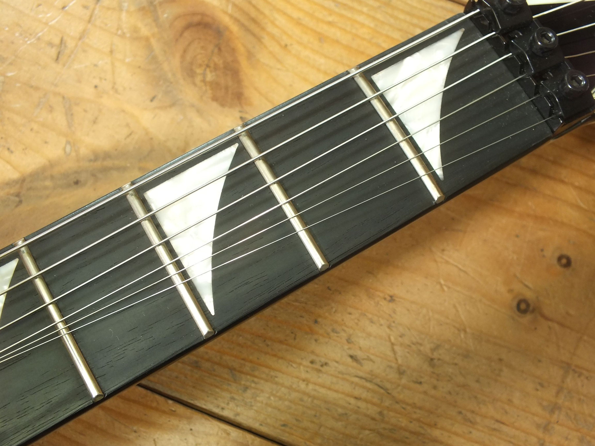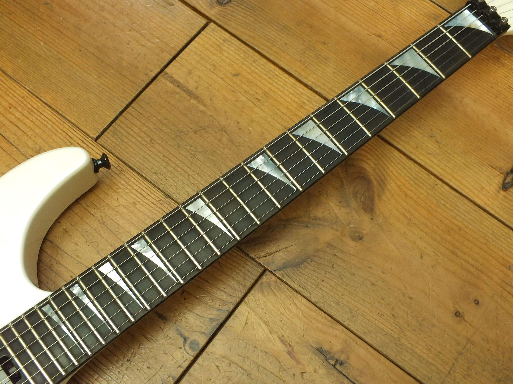 Neckthrough Konstruktion: Durchgehender, dreiteiliger Ahorn-Hals (schlankes Profil) mit Ebenholz-Griffbrett (12" - 16" Compound-Radius), Pearloid Sharkfin-Inlays und 24 Jumbo-Bünden.