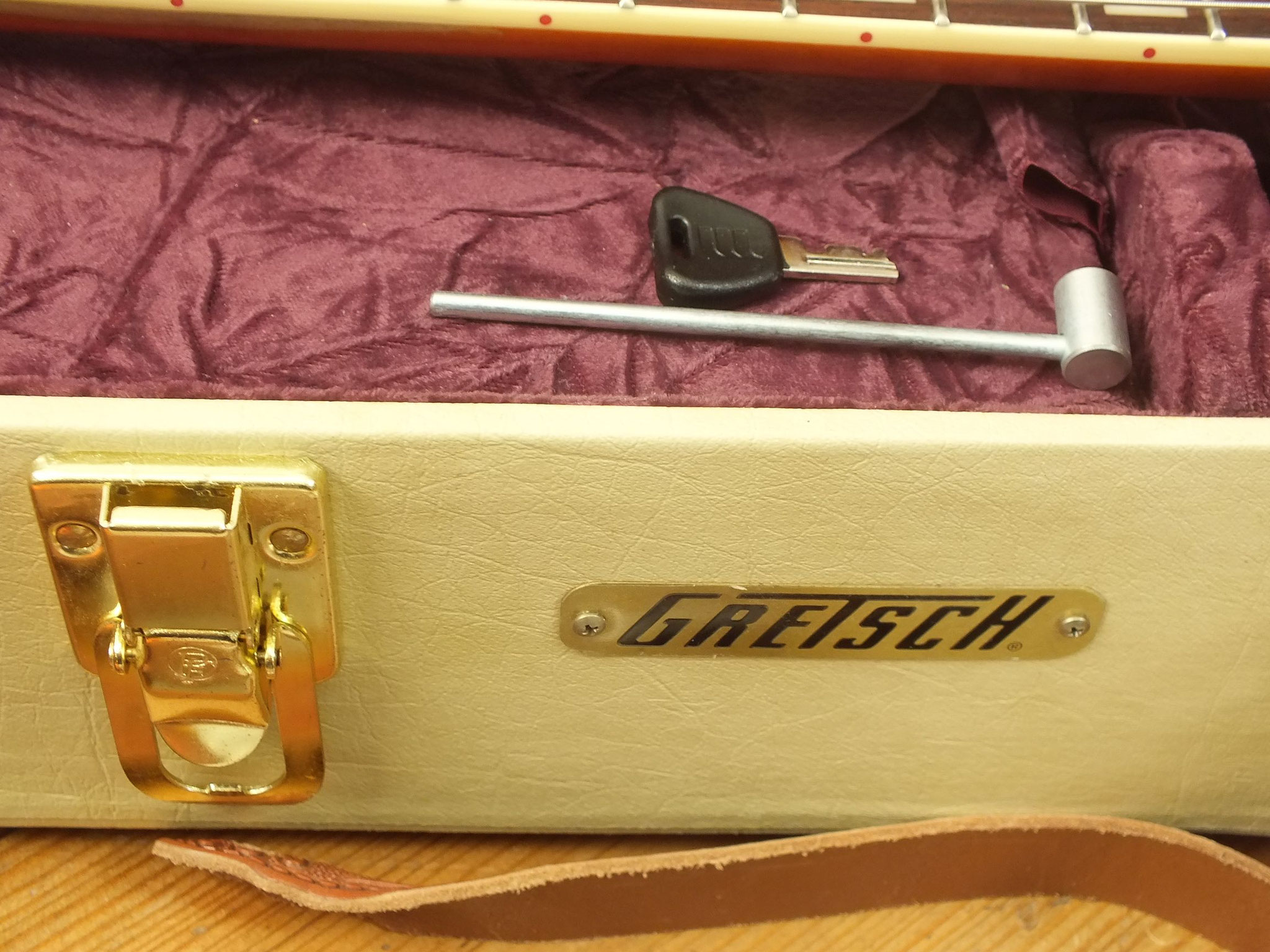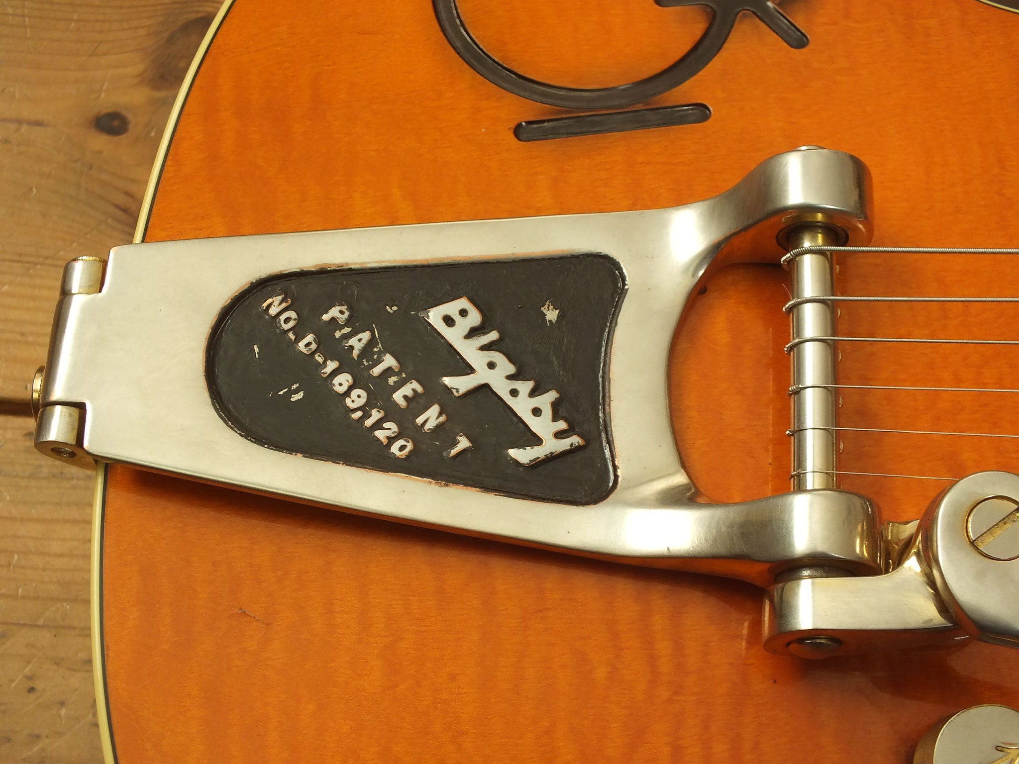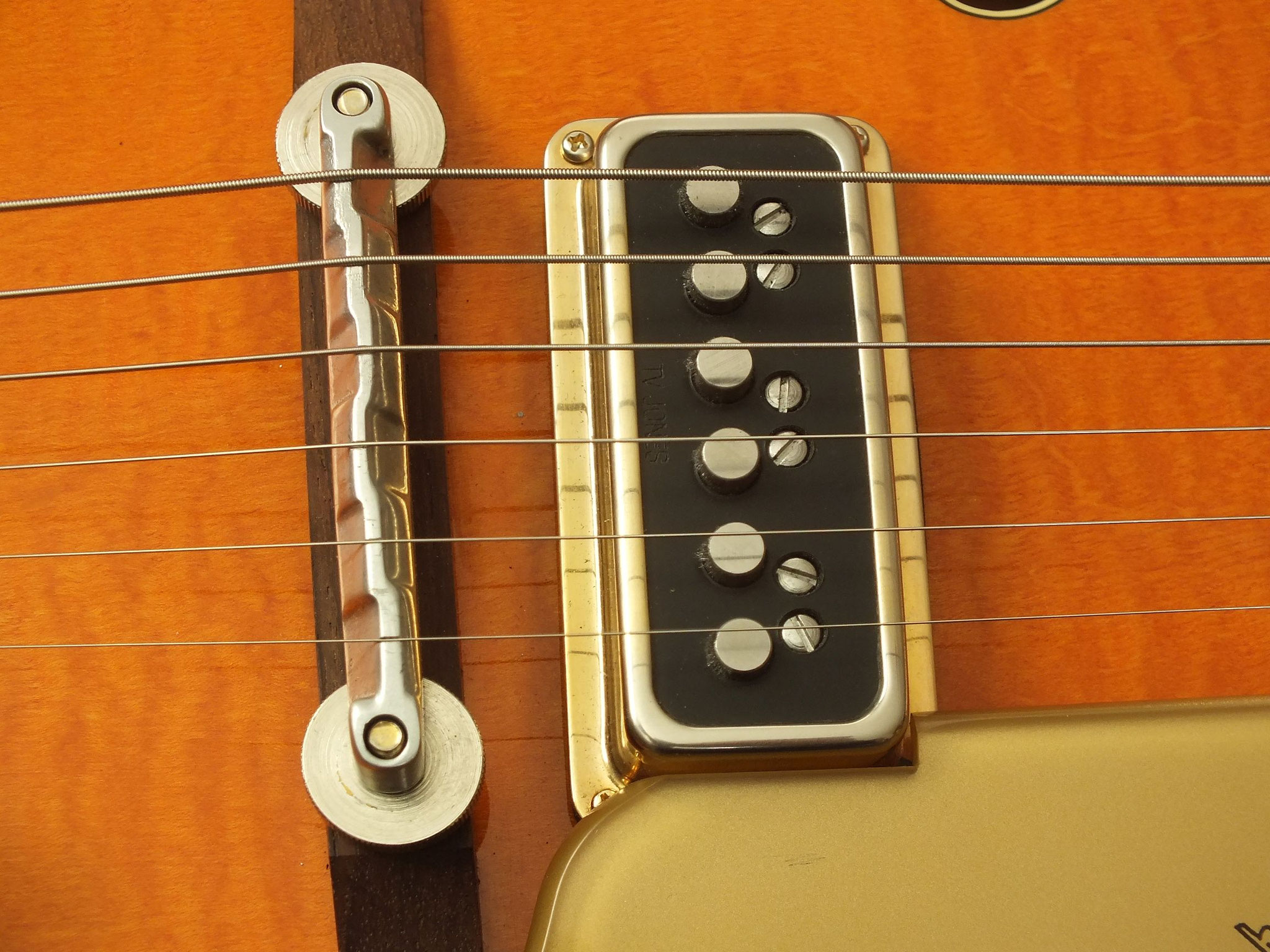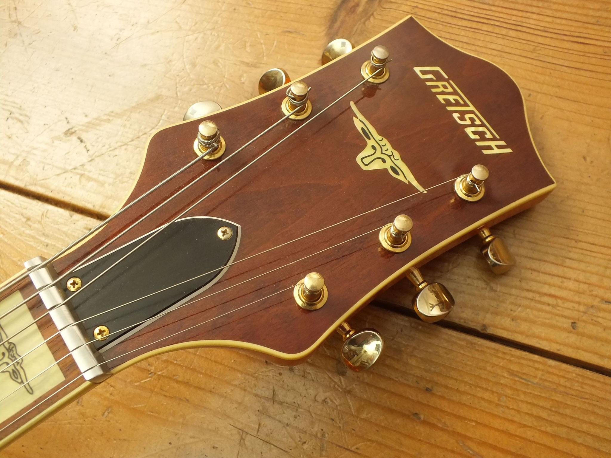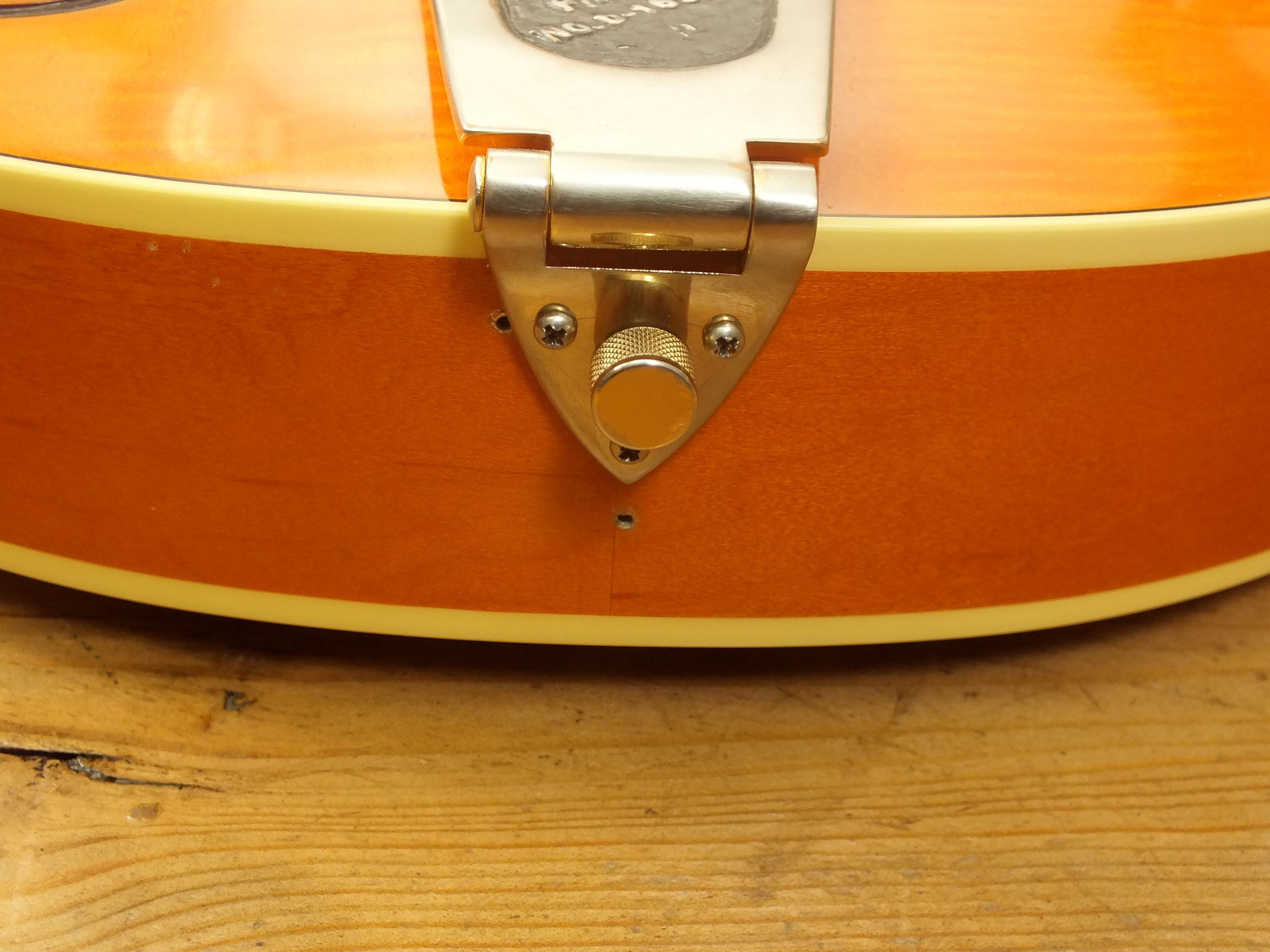 Die Bridge wurde gegen eine Gretsch Rollen-Bridge wie bei der White Falcon ausgetauscht. Das Original-Teil liegt bei.