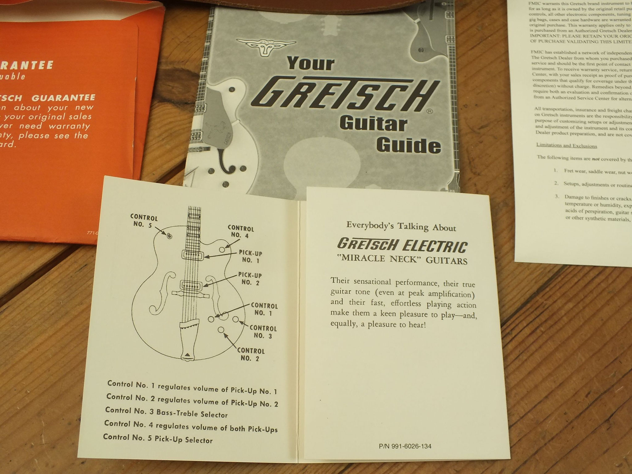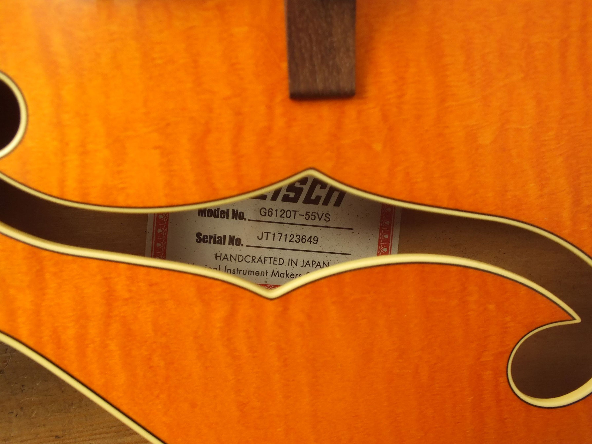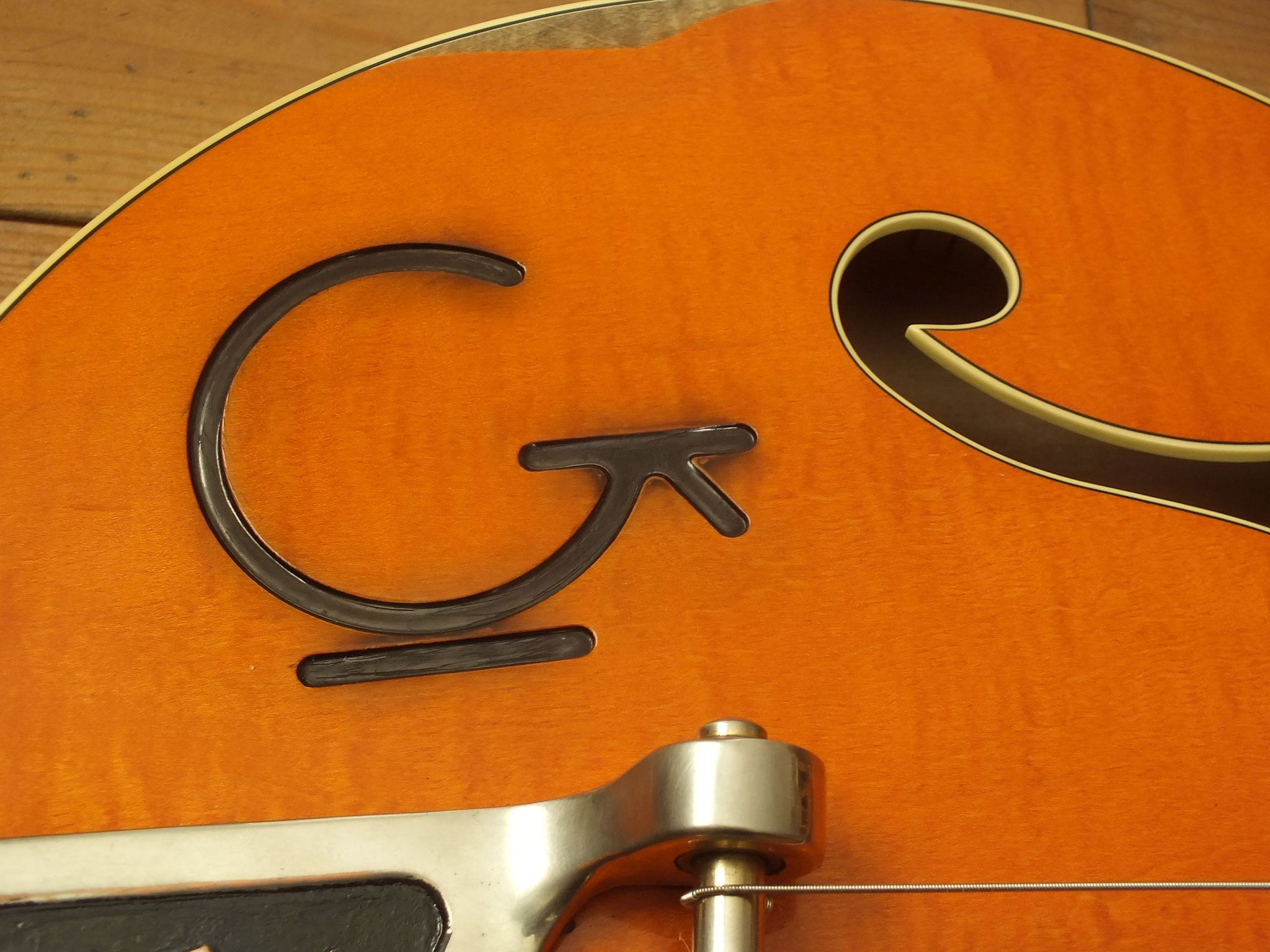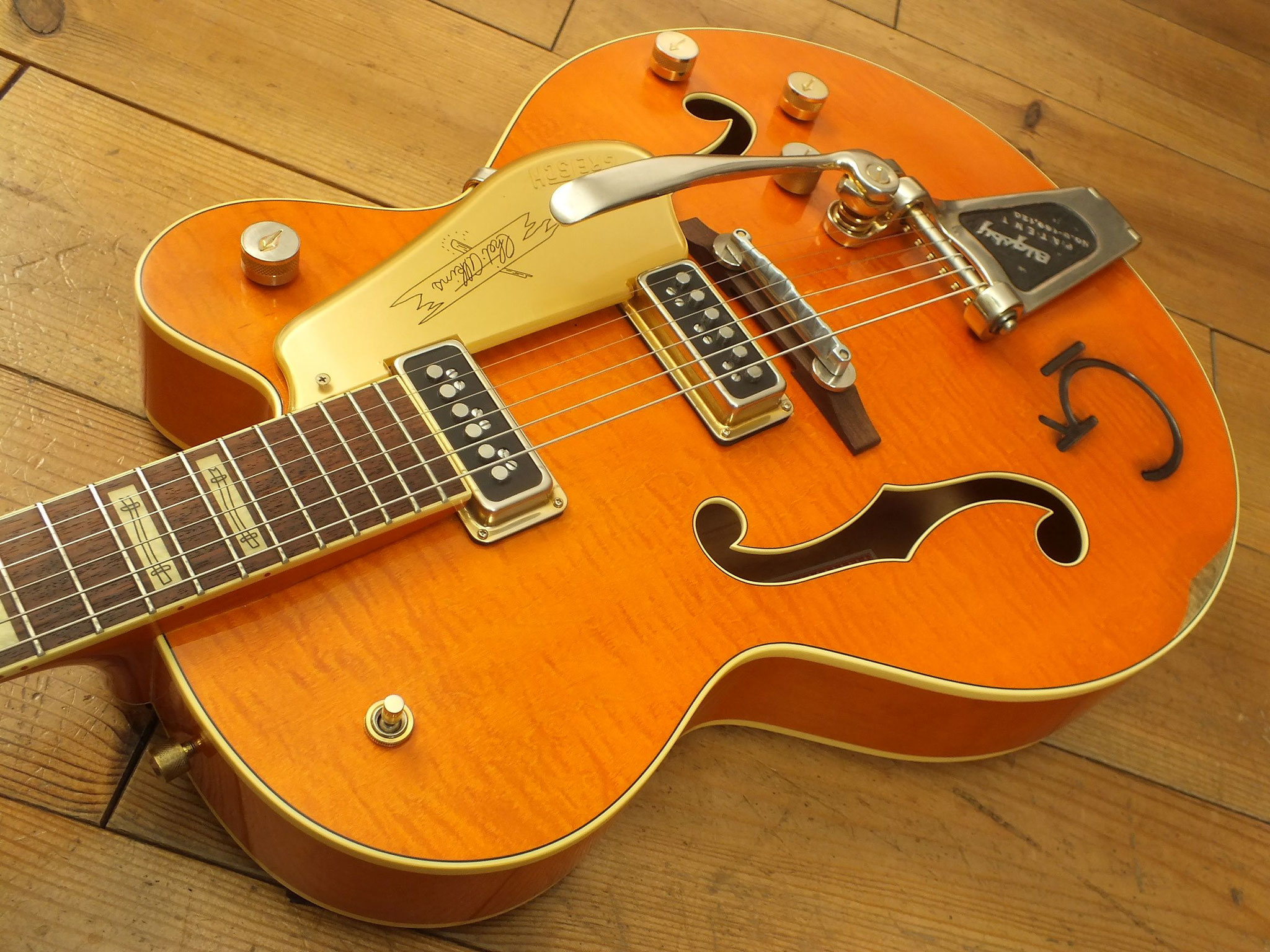 Die Bridge wurde gegen eine Gretsch Rollen-Bridge wie bei der White Falcon ausgetauscht. Das Original-Teil liegt bei.