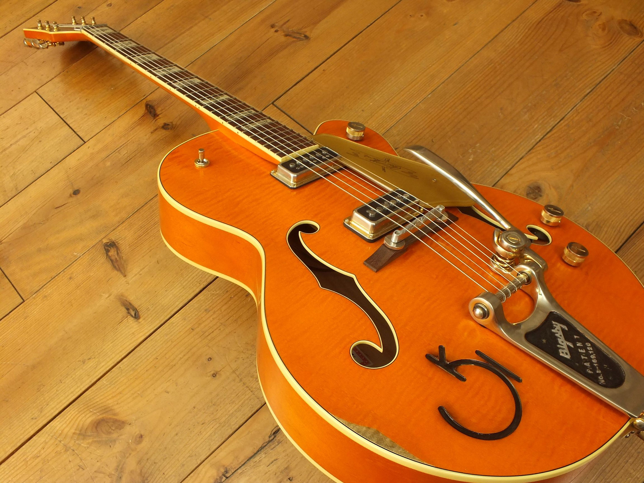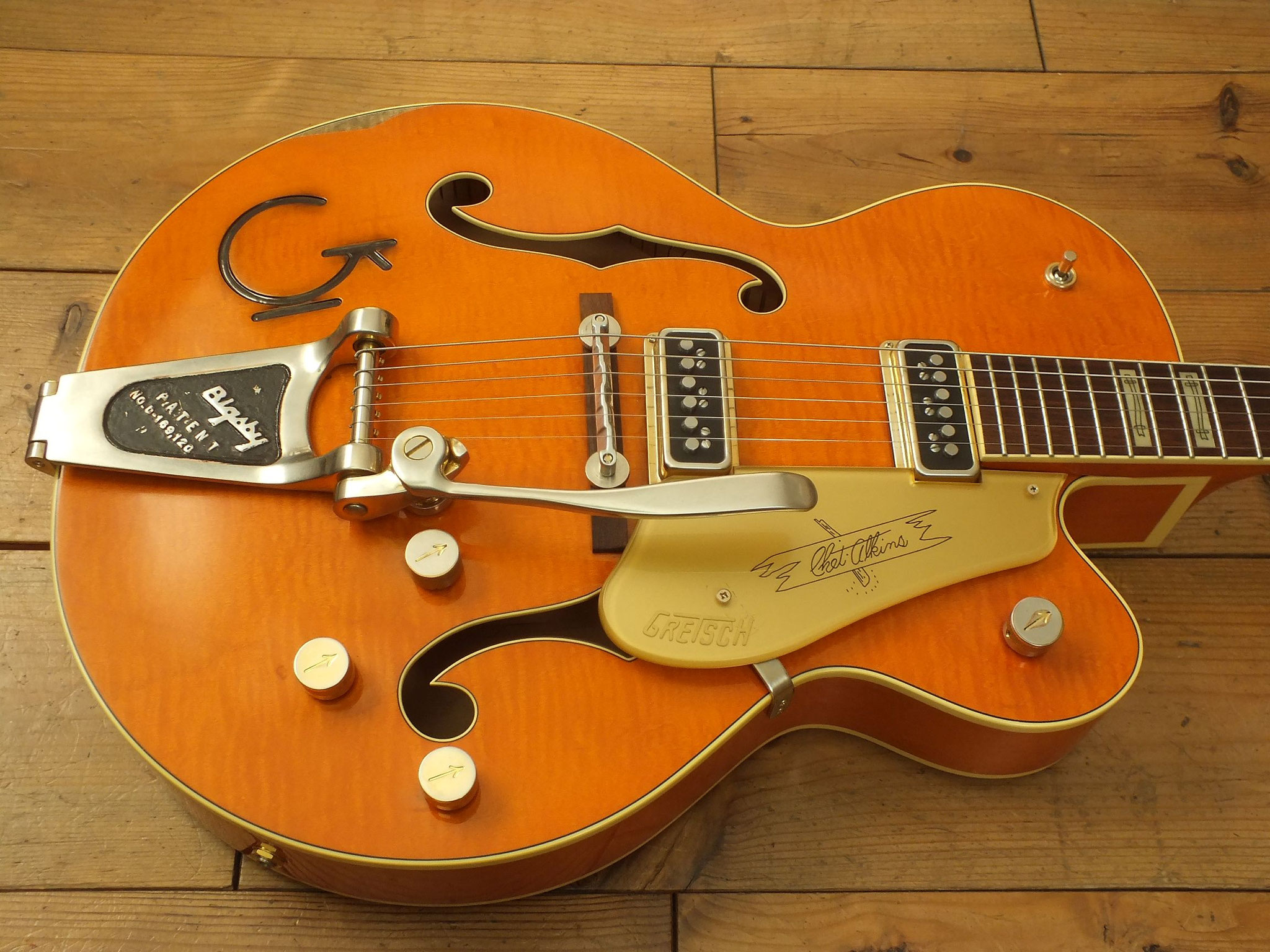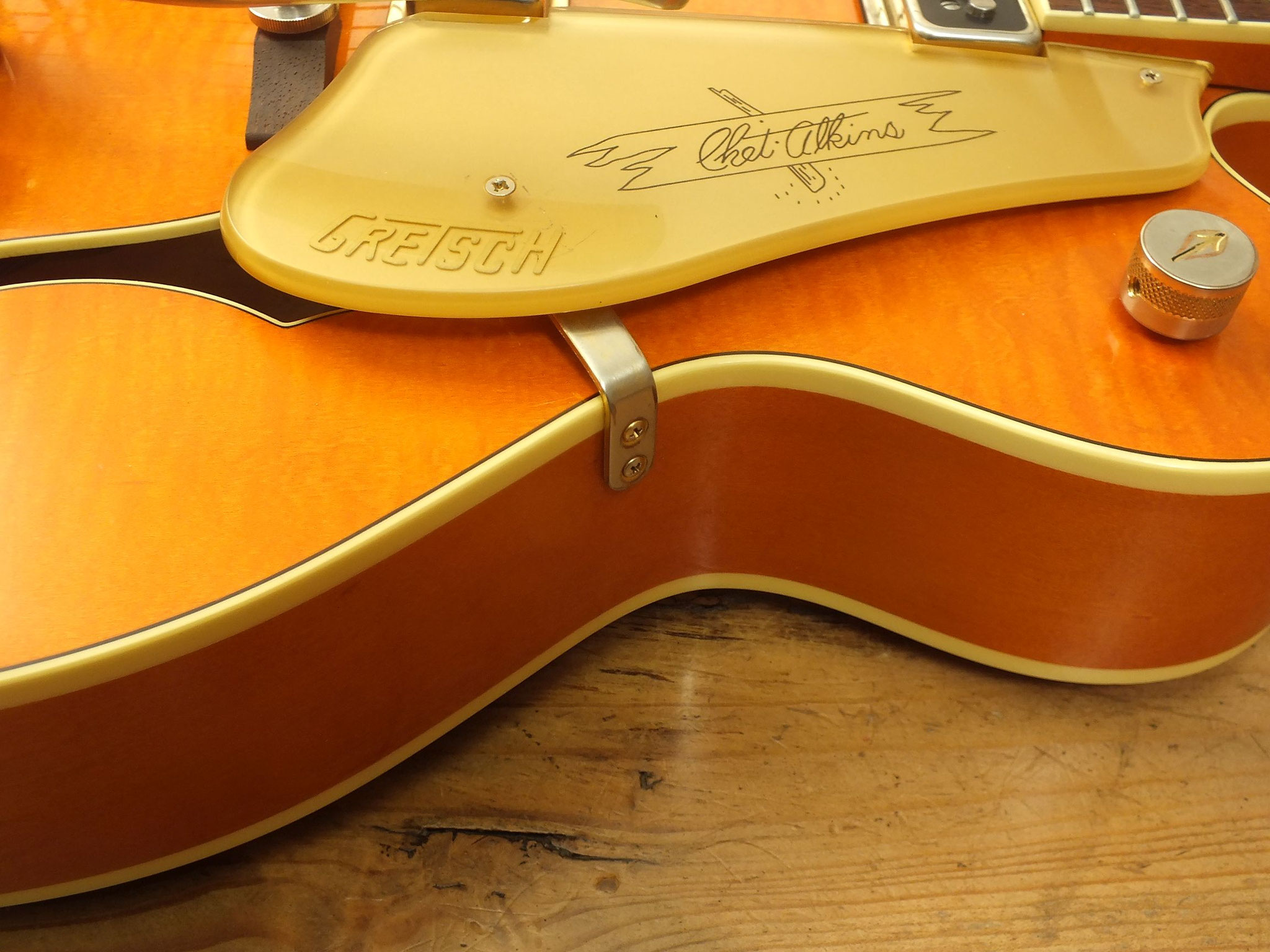 Vintage Semiakustik vom US-Hersteller Gretsch im klassischen "Western Orange Stain" Finish. Signature-Modell der amerikanischen Gitarren-Legende Chet Atkins.