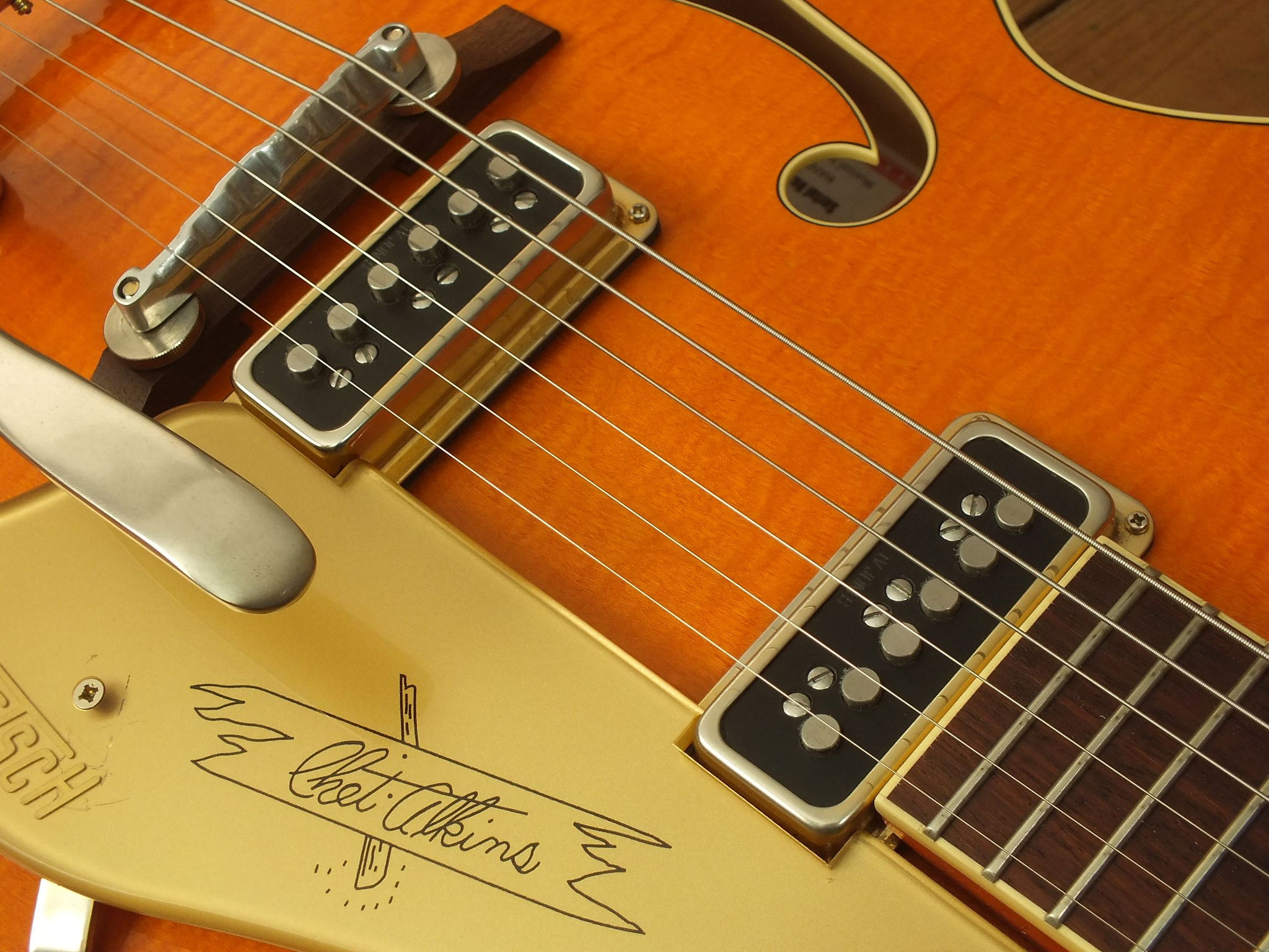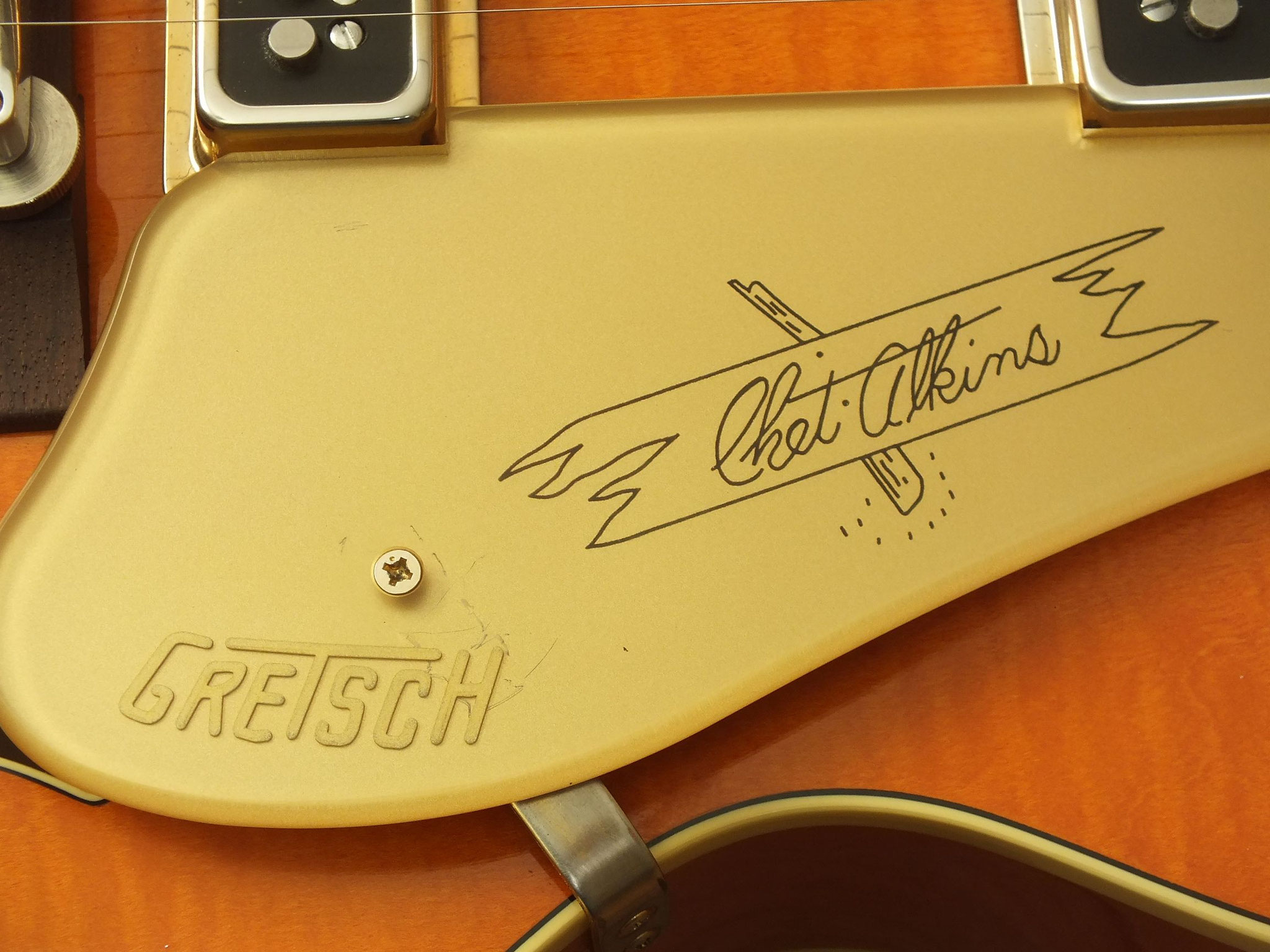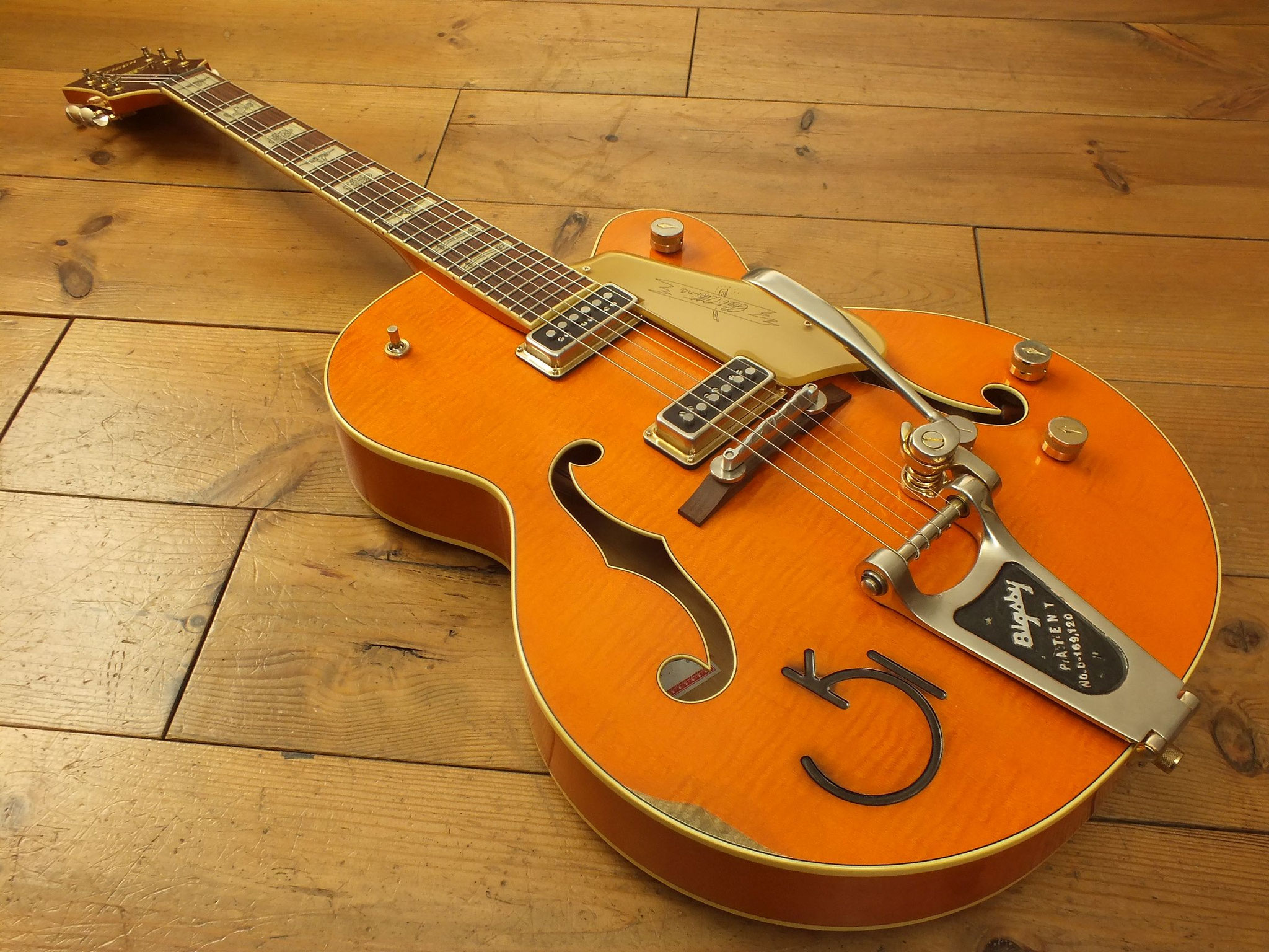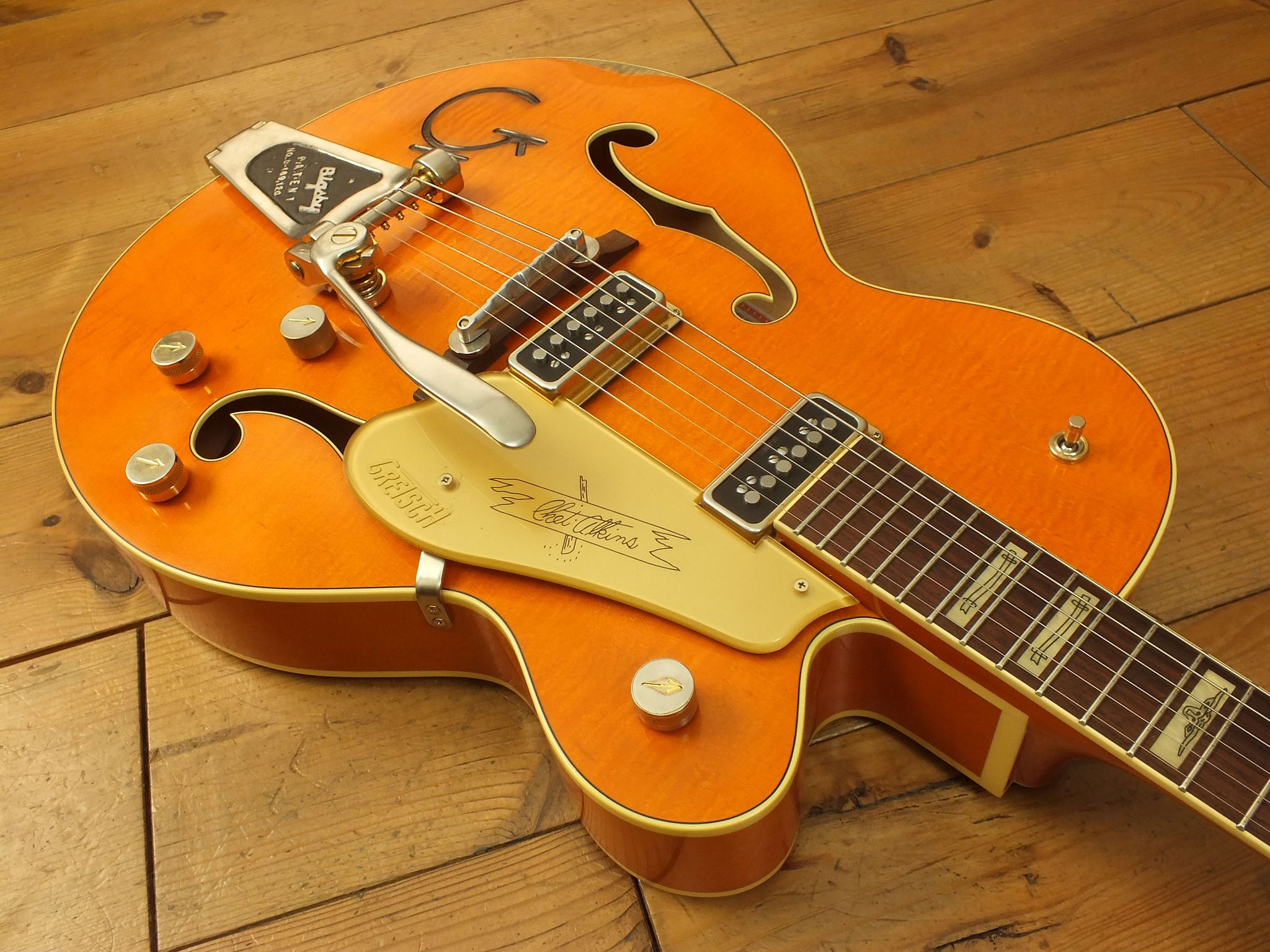 Vintage Semiakustik vom US-Hersteller Gretsch im klassischen "Western Orange Stain" Finish. Signature-Modell der amerikanischen Gitarren-Legende Chet Atkins.