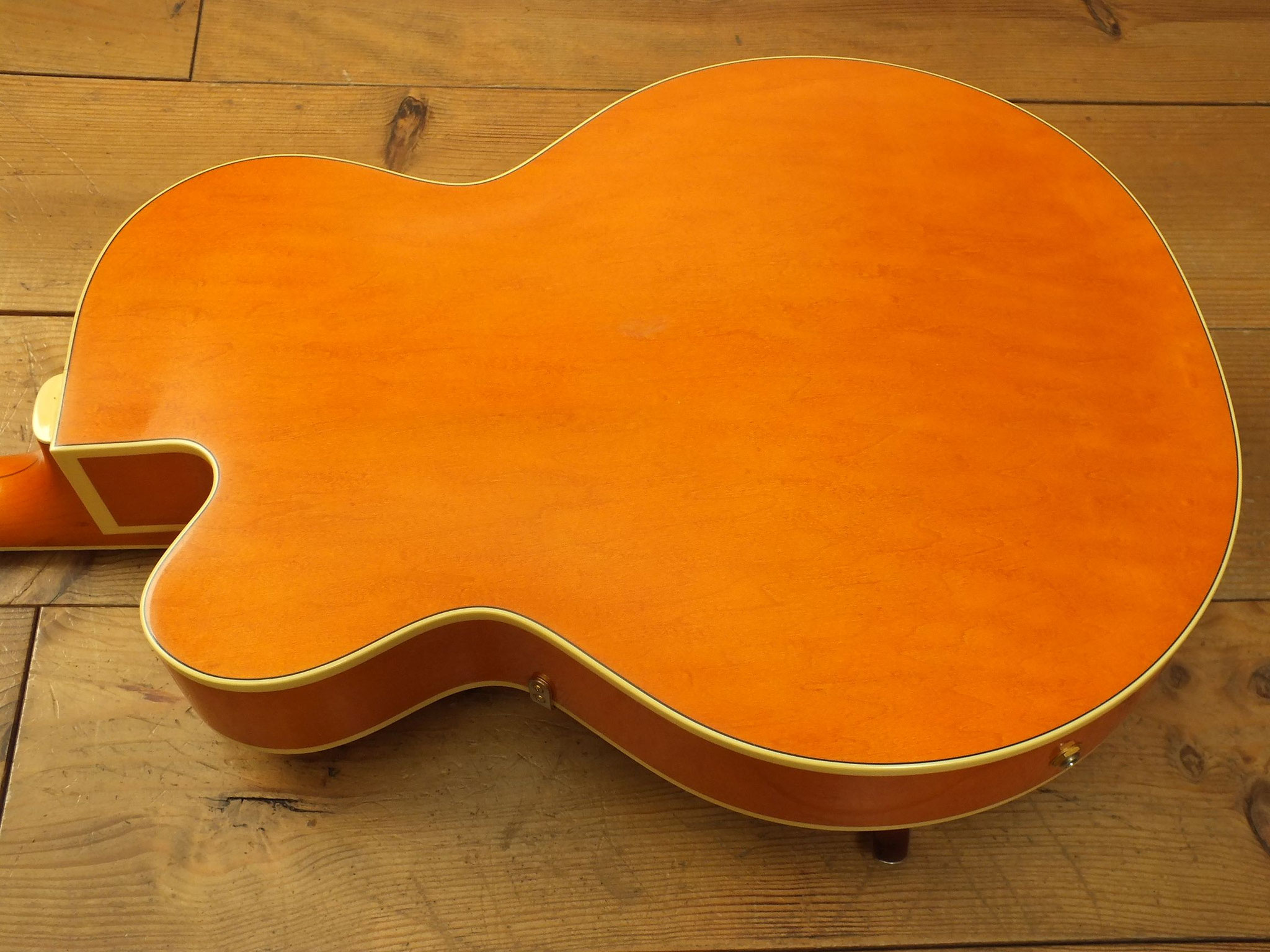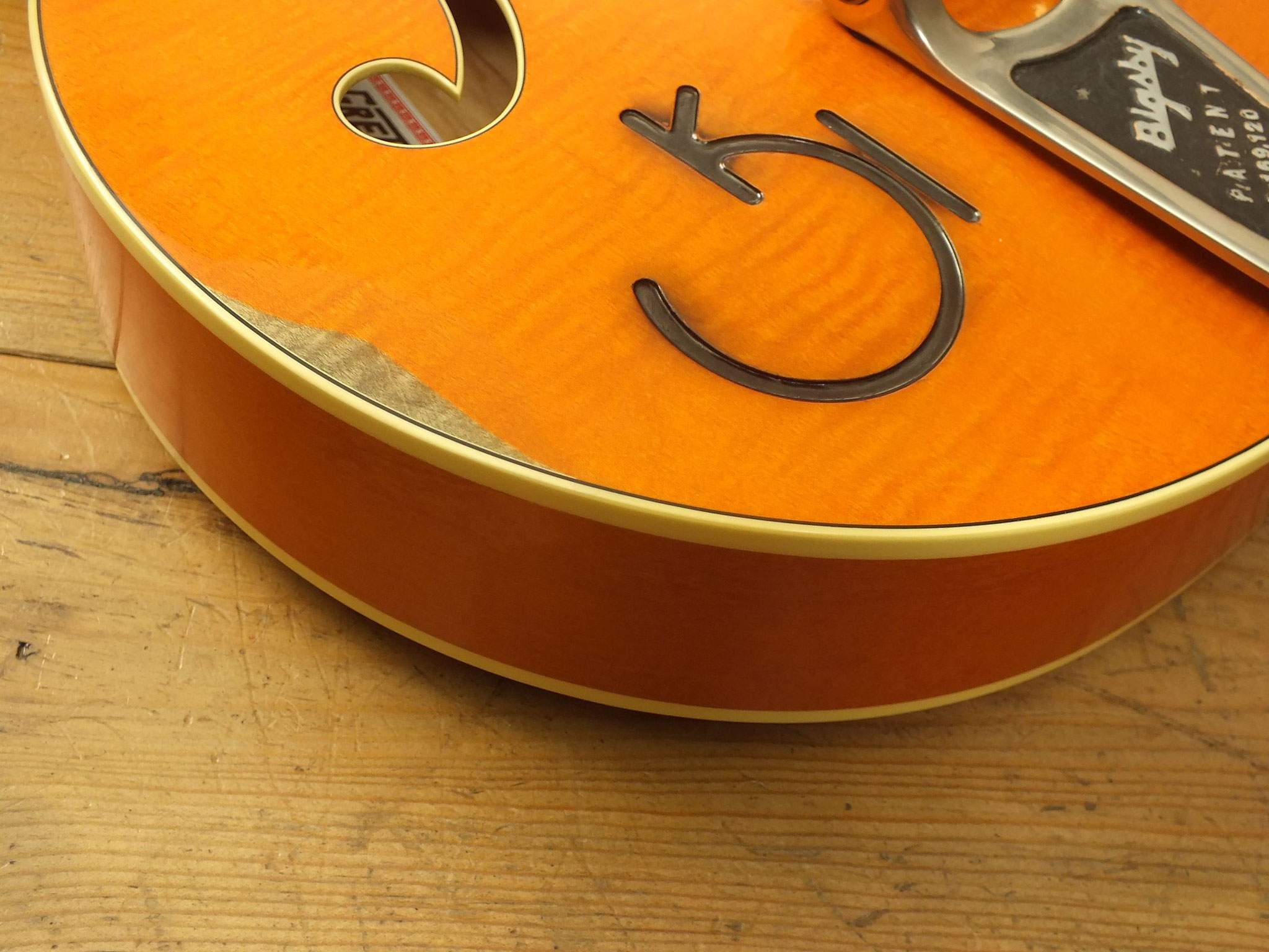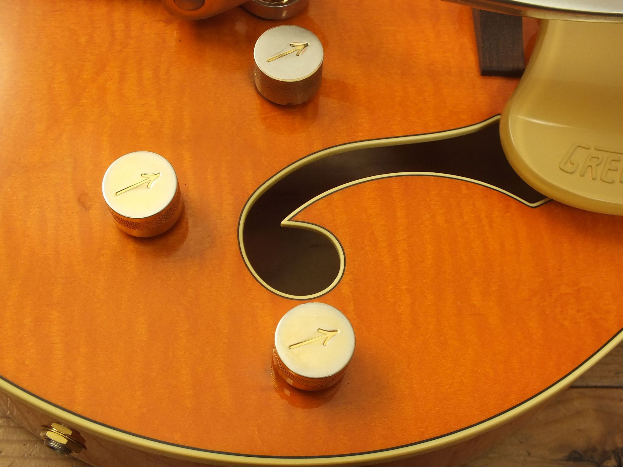 Hollowbody-Bauform aus Ahorn mit "Flamed Top" im "Aged Gretsch Orange" Finish.