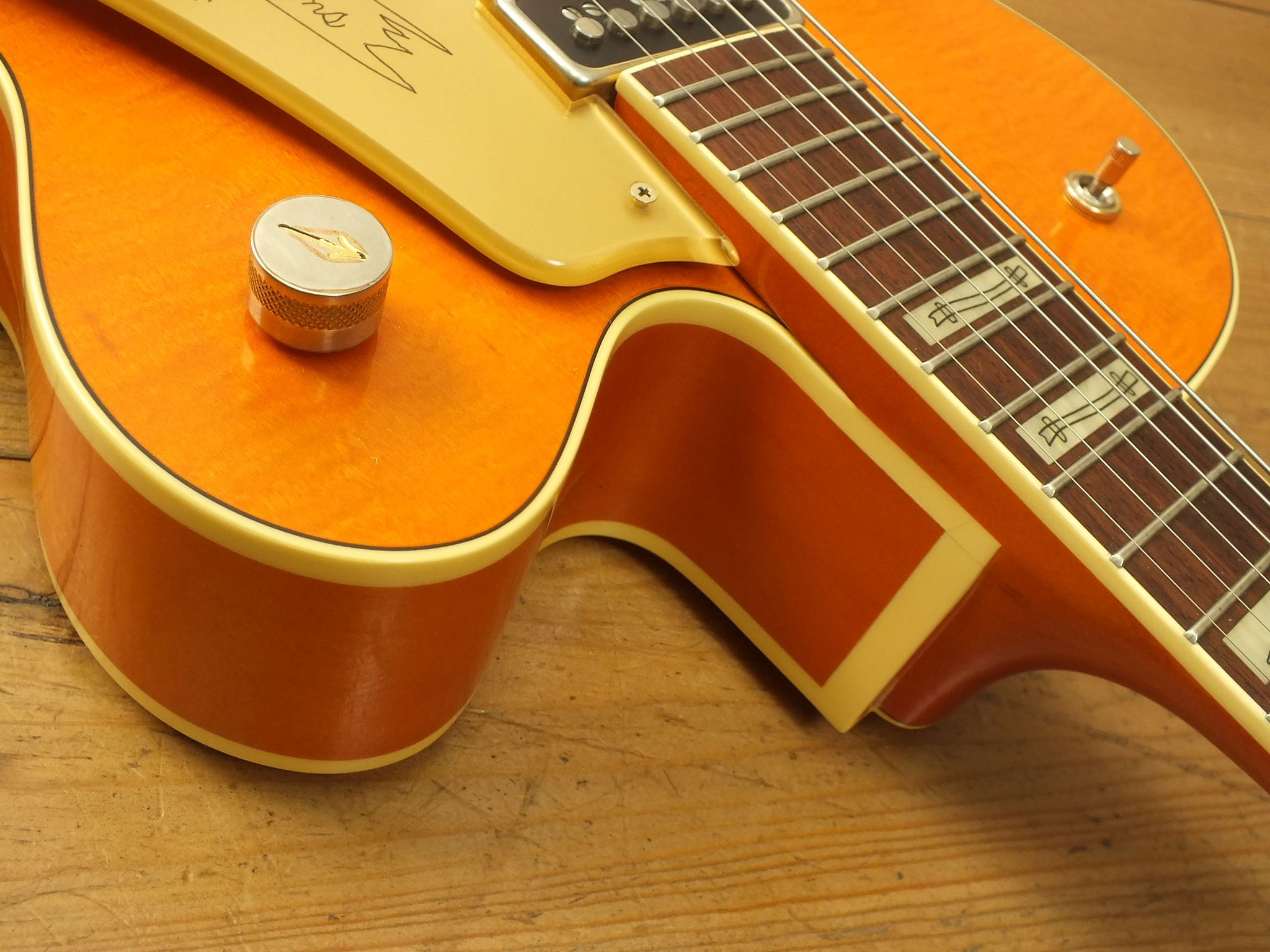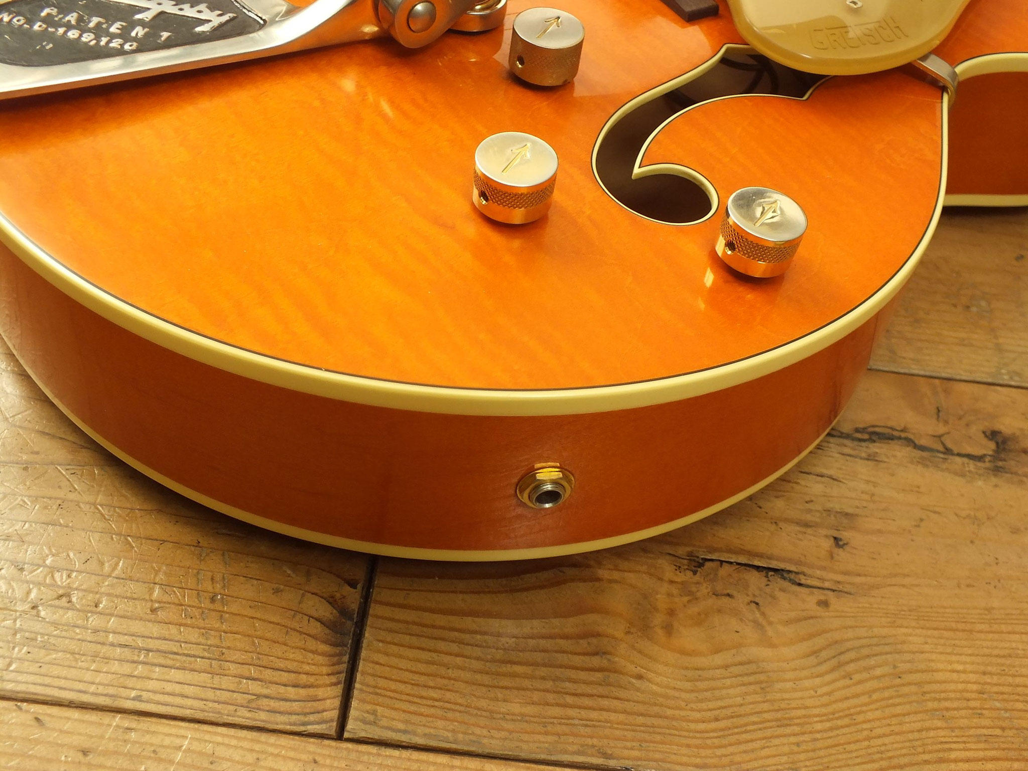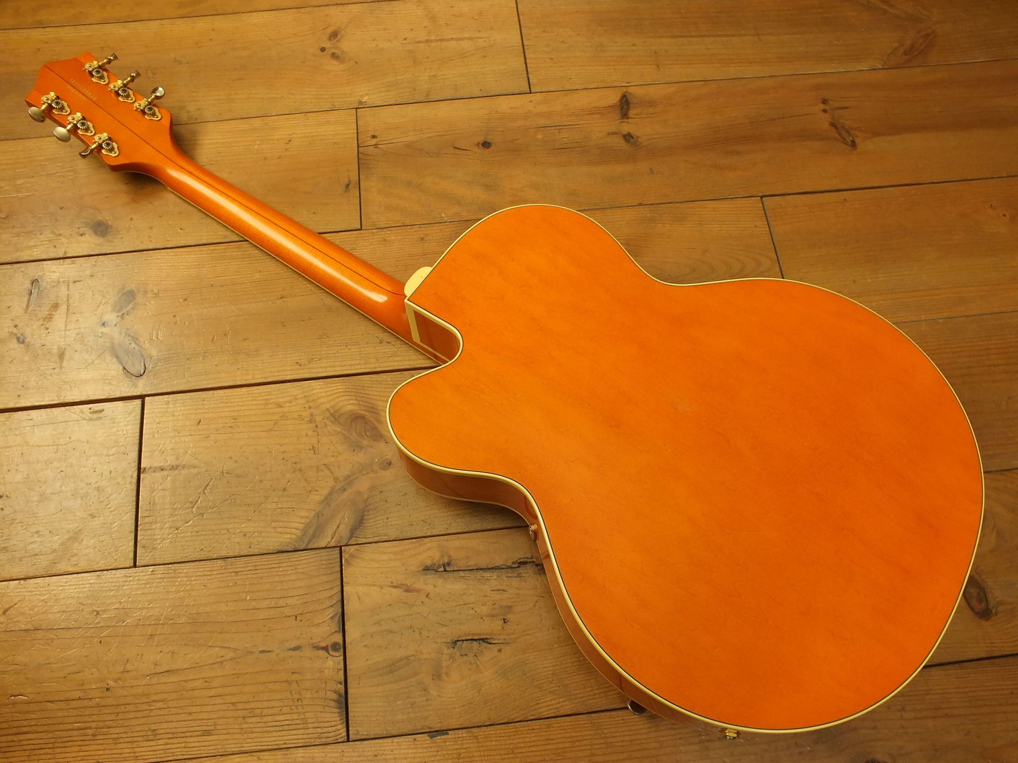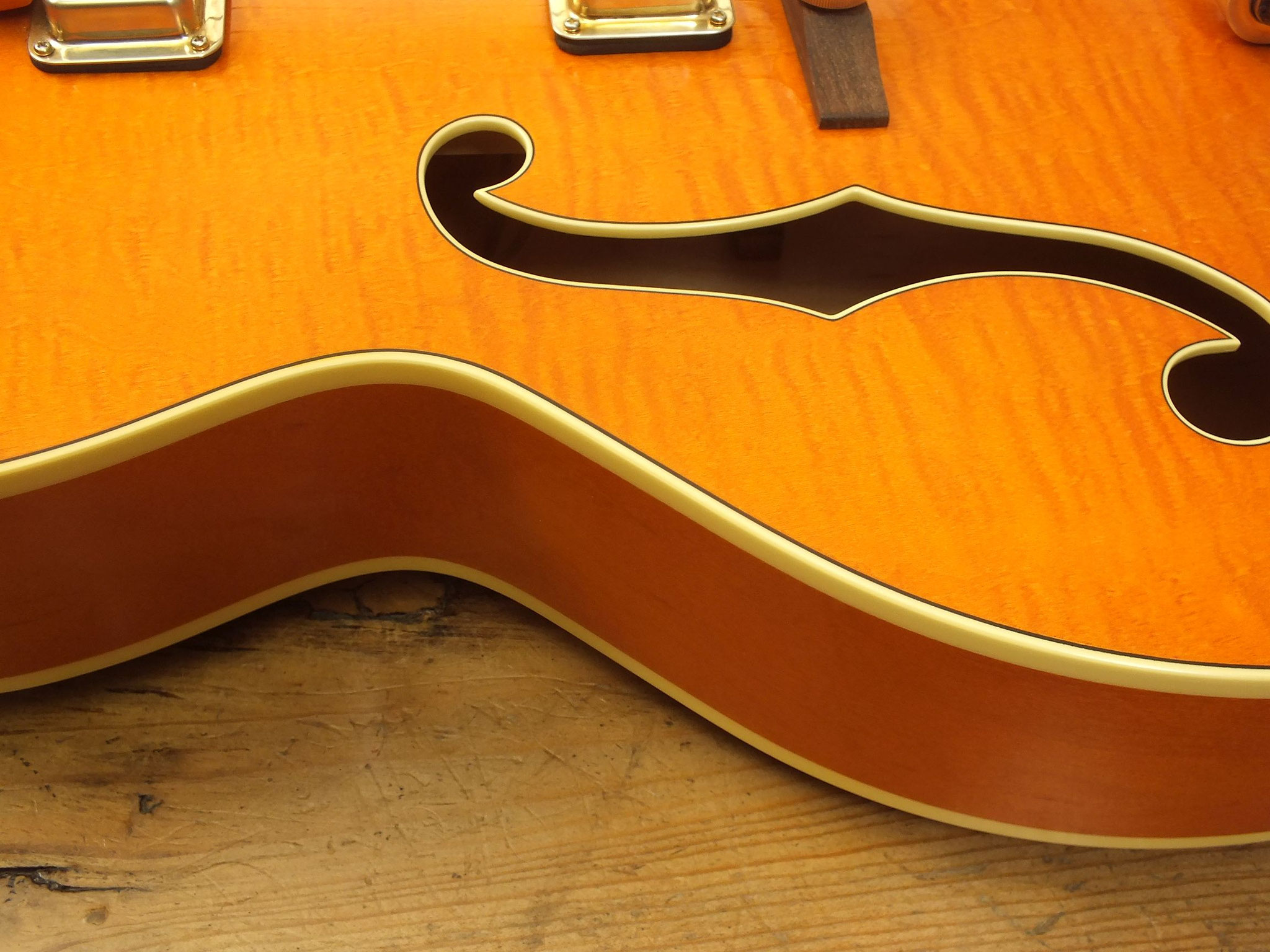 Hollowbody-Bauform aus Ahorn mit "Flamed Top" im "Aged Gretsch Orange" Finish.
