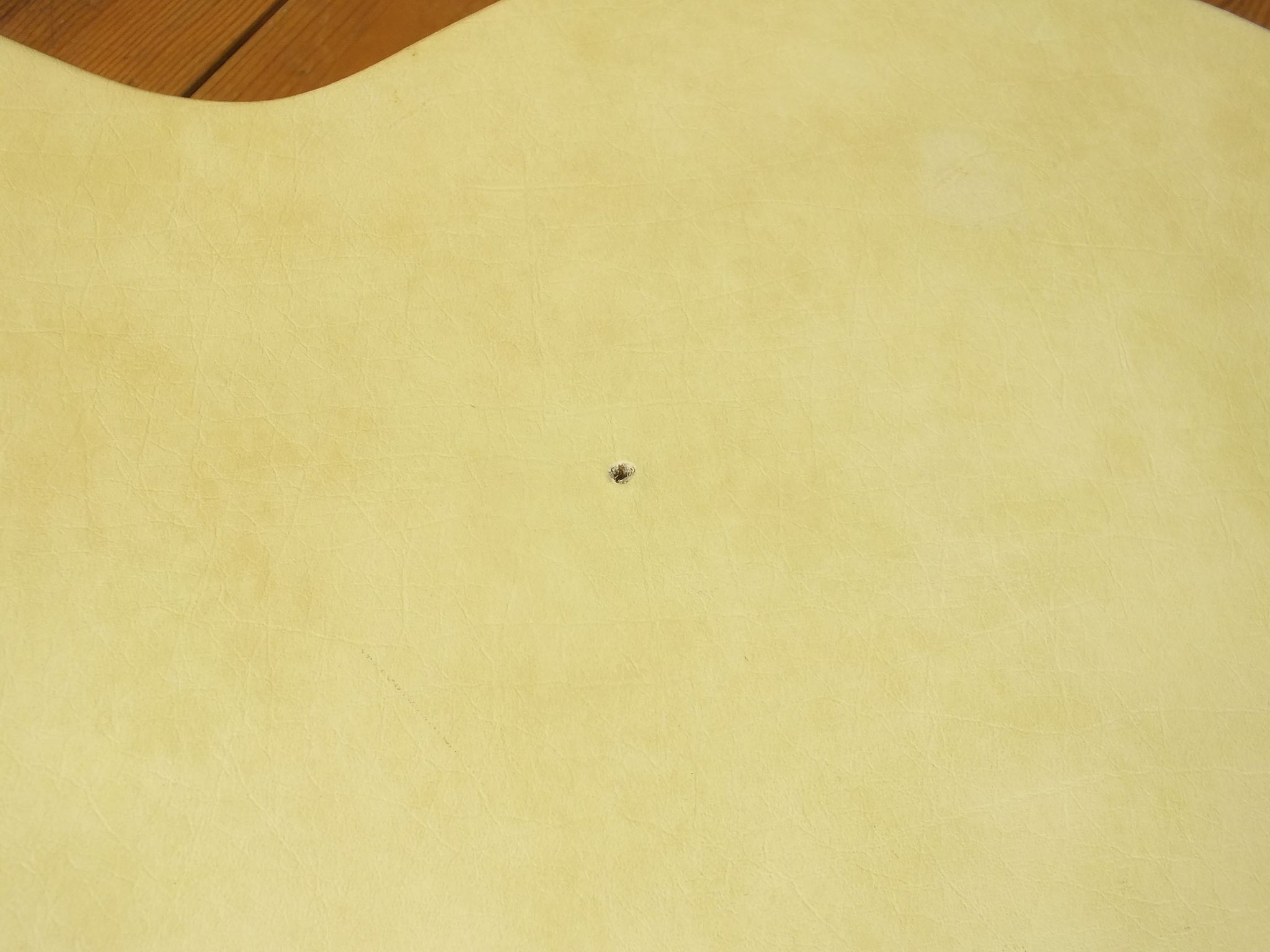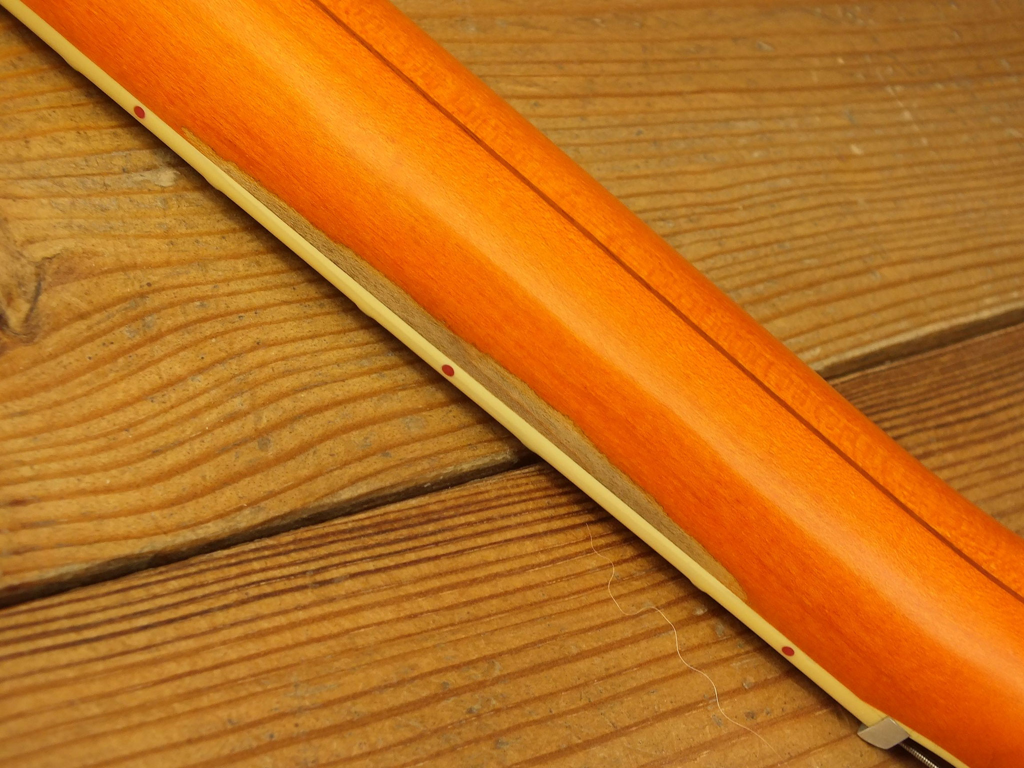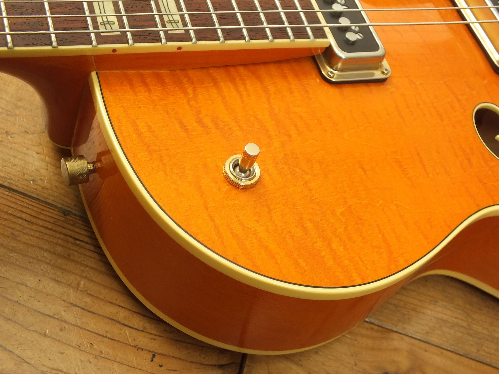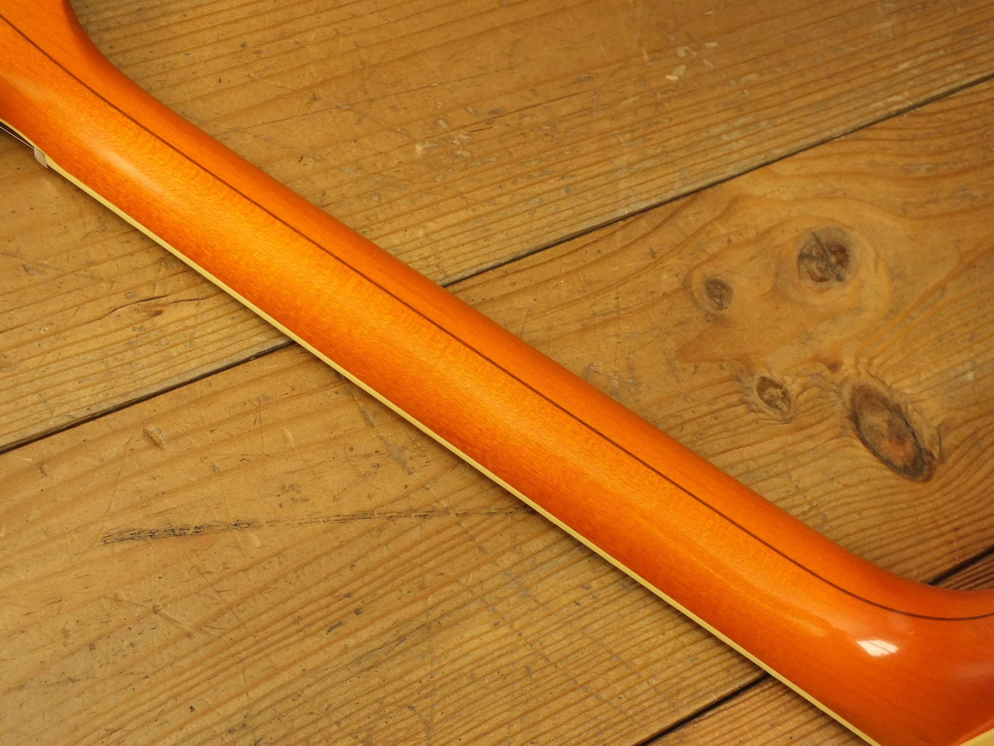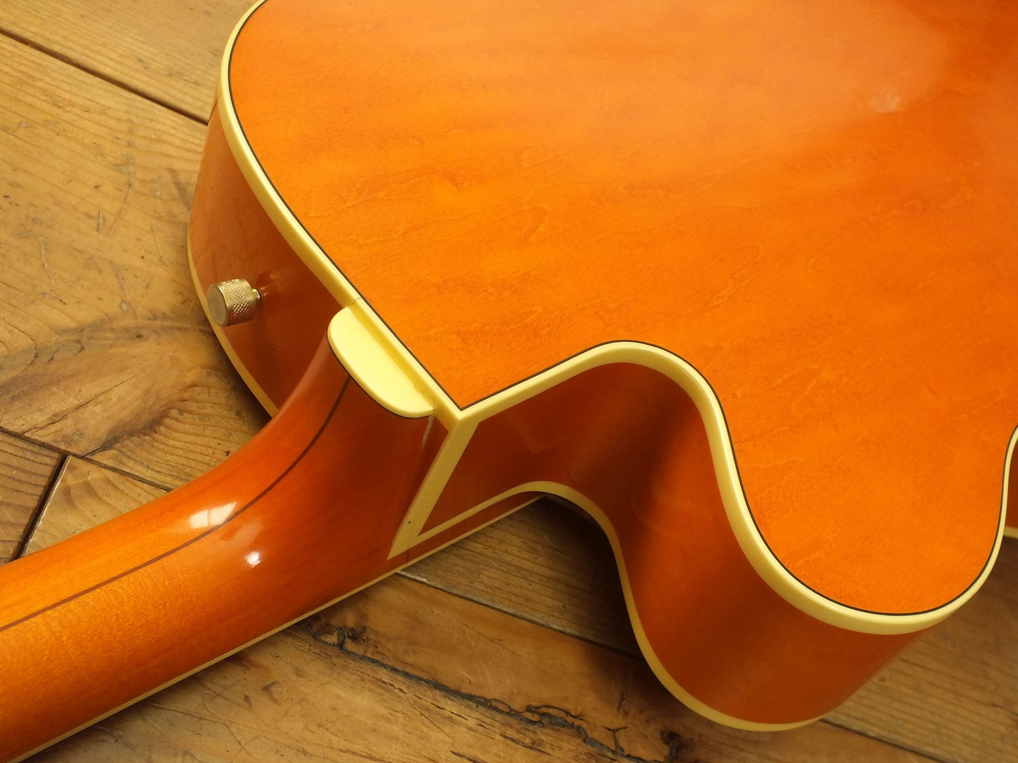 Laminierter Ahorn-Body mit "Fake F-Holes" und dem charakteristischen "Stuhlkissen" als Schutz vor Beschädigungen auf der Rückseite.