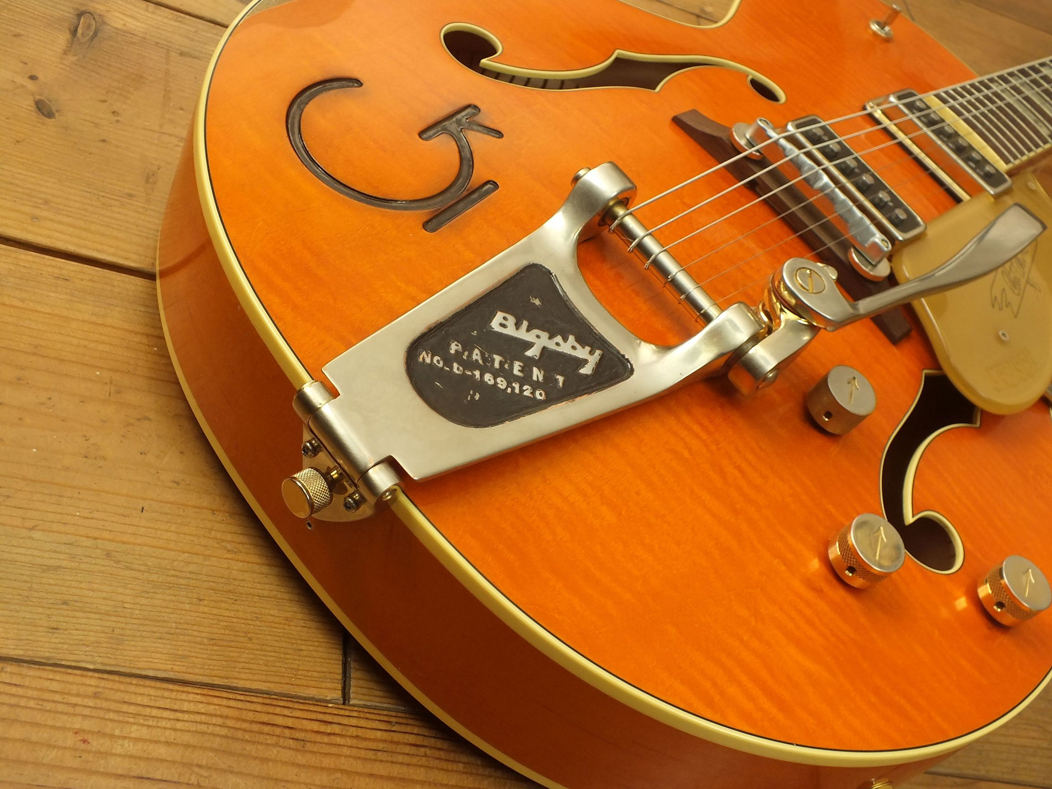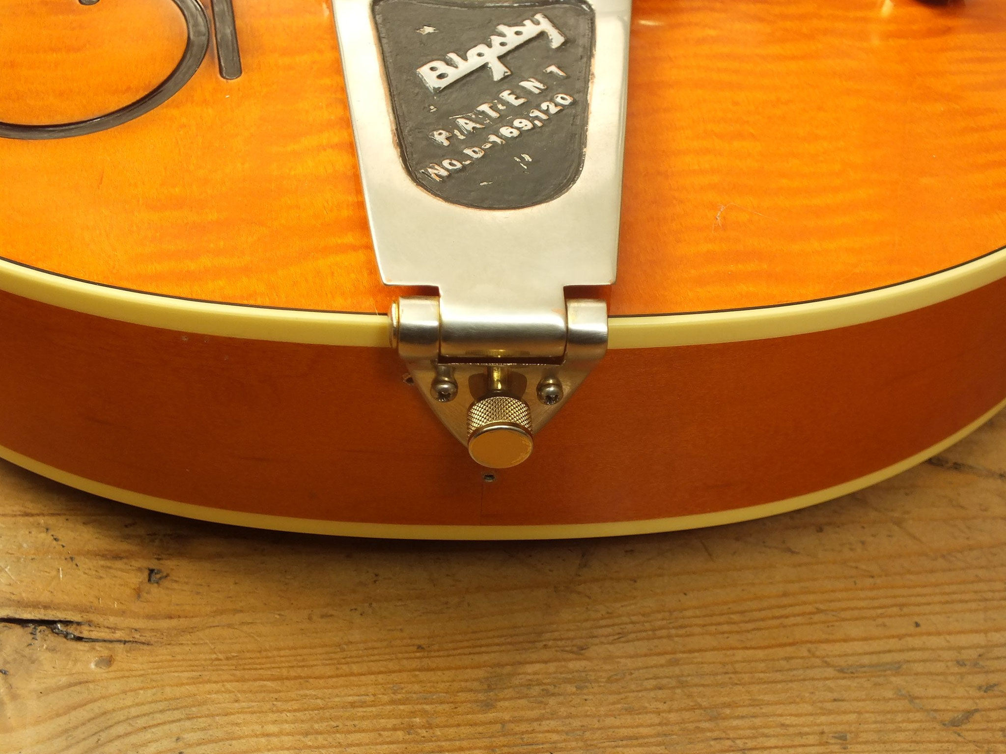 Die Bridge und das Bigsby Tremolo sind alte Original-Teile, die der Vorbesitzer sich extra für diese Gitarre besorgt hat.