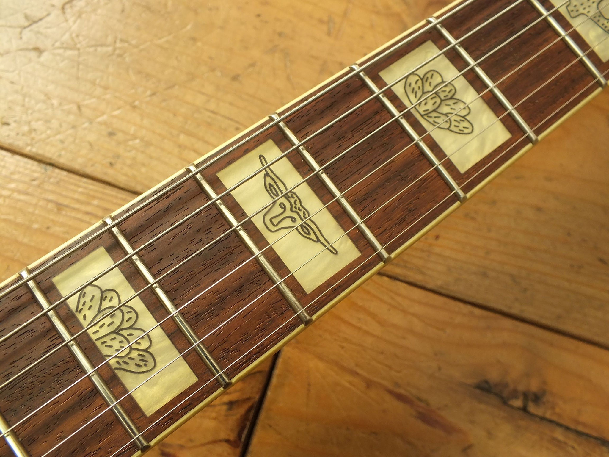 Ahornhals mit Walnuss-Streifen, Palisander-Griffbrett (12" Radius) mit Western Block-Inlays und 22 Medium-Bünden.