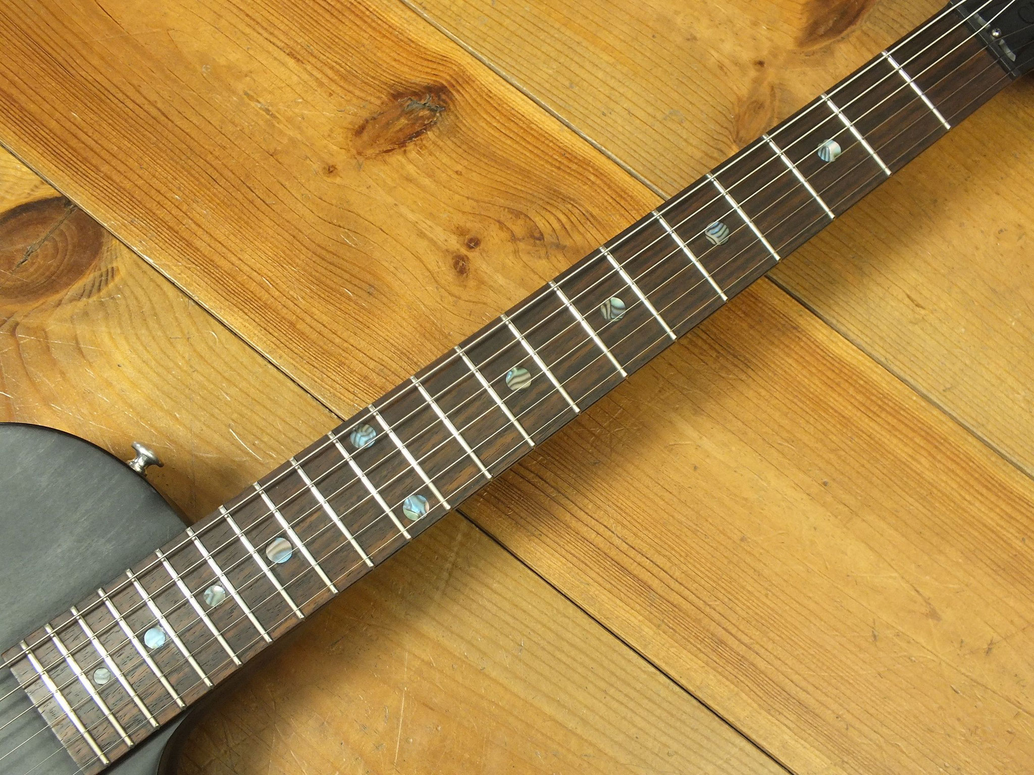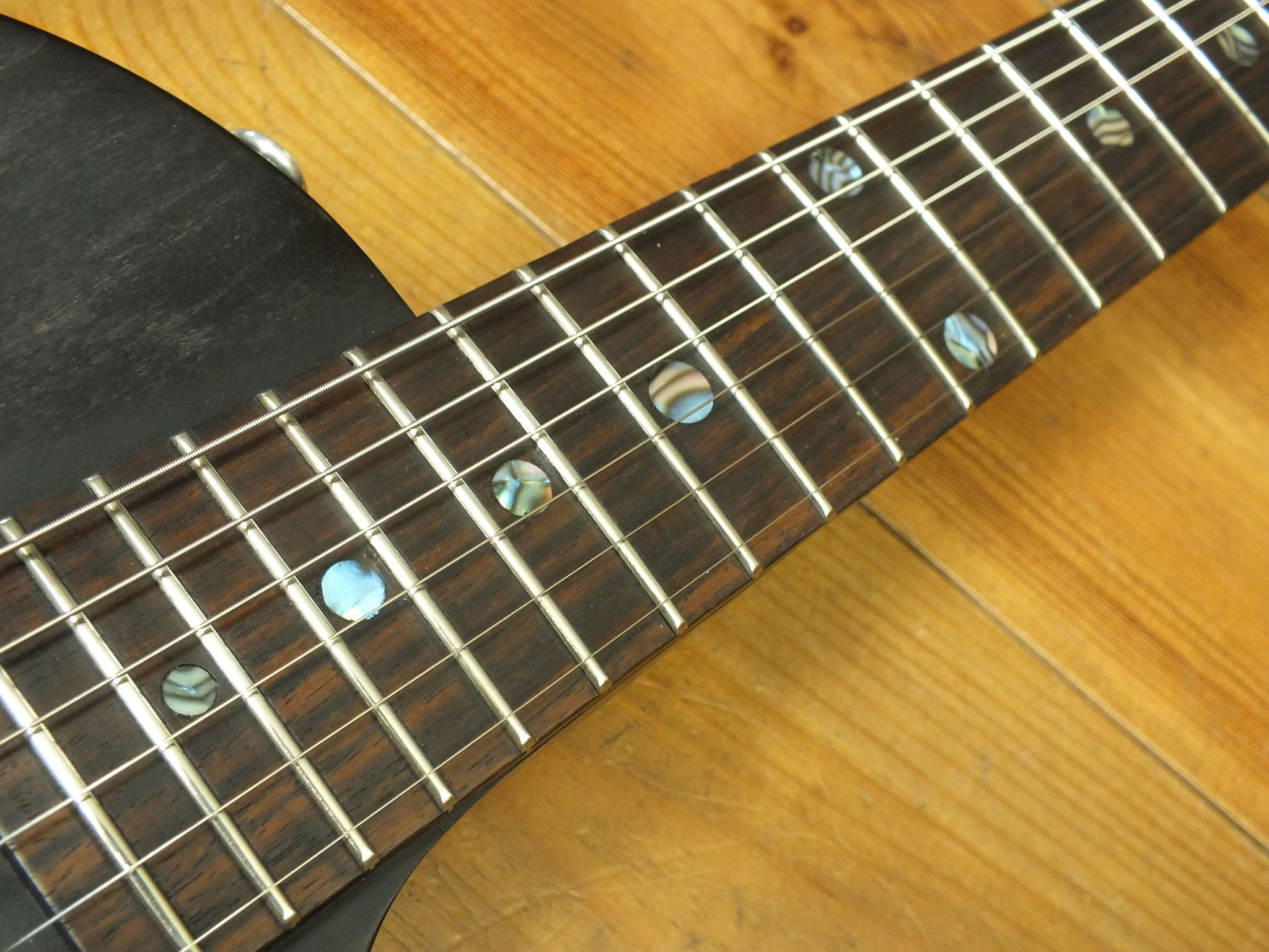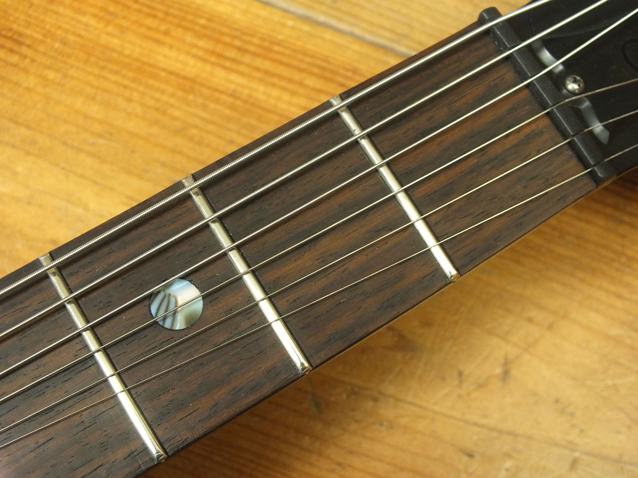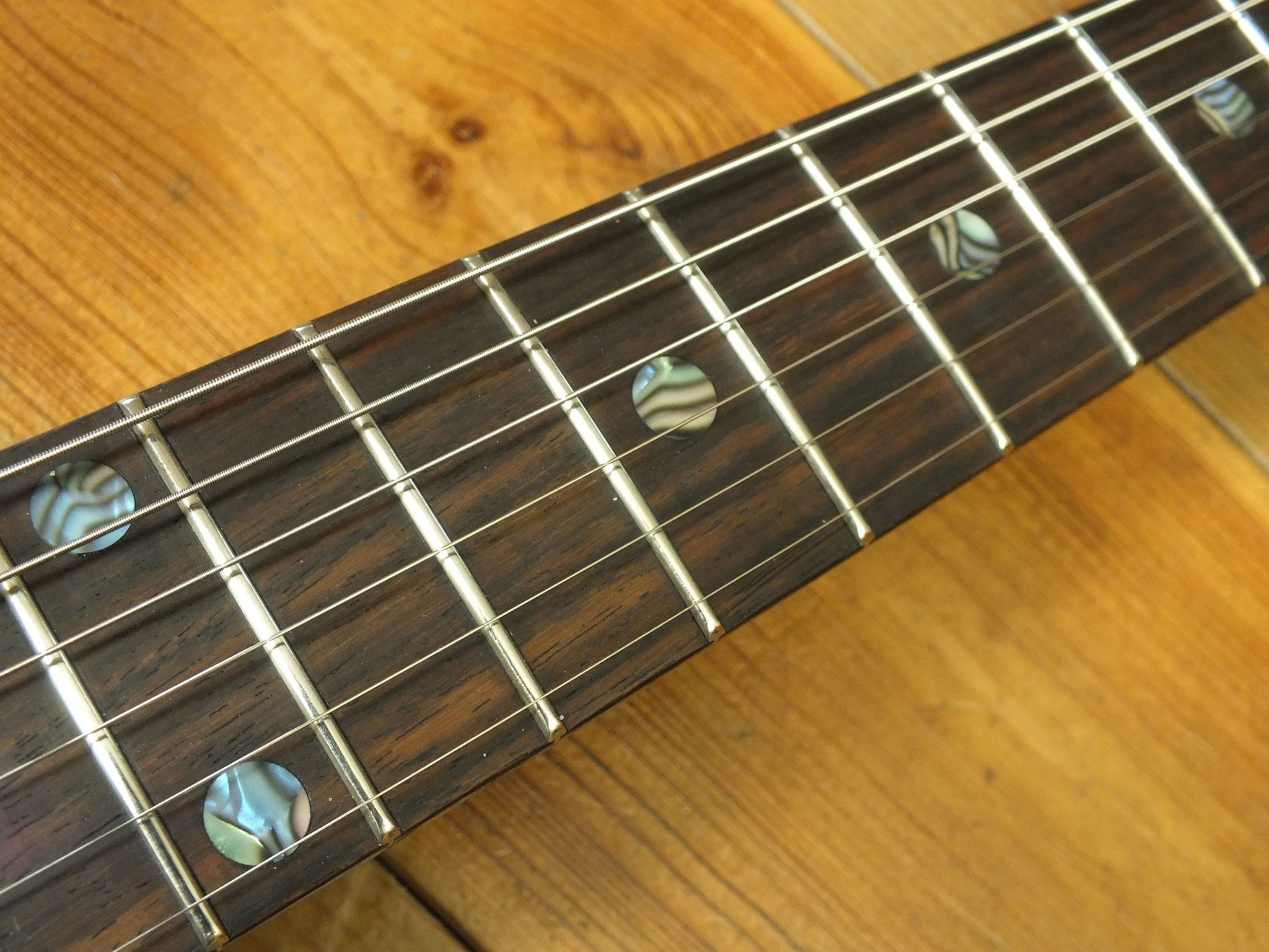Das Griffbrett besteht aus Ebenholz mit "Angel Wing" Inlays und 24 Bünden, welche ab dem 12. Bund etwas schmaler ausfallen, um die Bespielbarkeit in den oberen Lagen zu erleichtern.